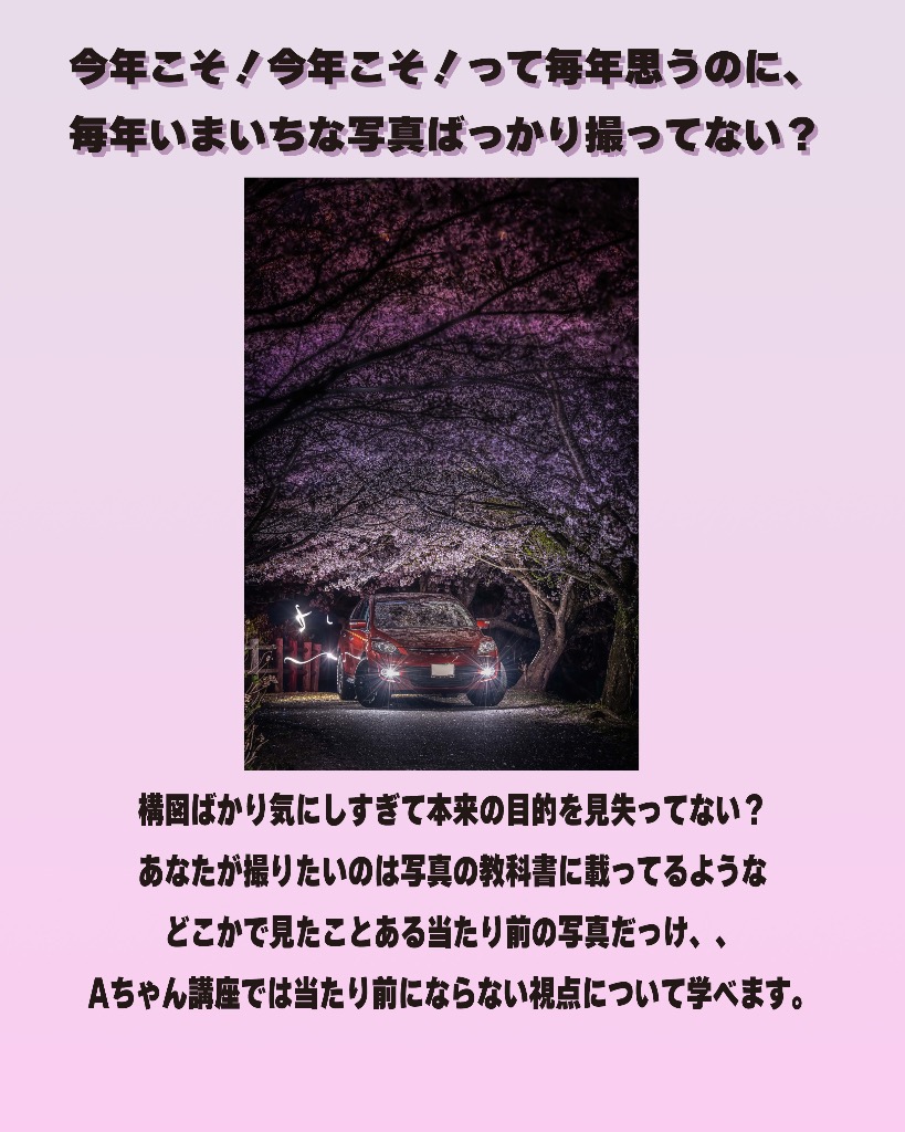 一年に一度しかないこの時期に息を呑むような圧倒的な、かっこいい桜と愛車の写真の撮り方を桜が咲く前に、オンラインZoomにて学び、実際に現地でレッスンします♪